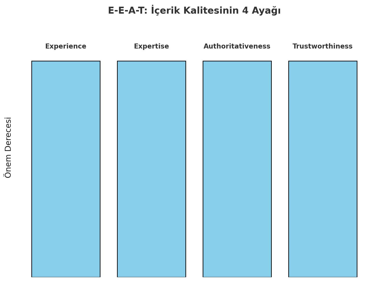 Bu tablo, içerik kalitesini belirleyen dört temel ayağı (Deneyim, Uzmanlık, Otorite, Güvenilirlik) eşit önemde vurguluyor.